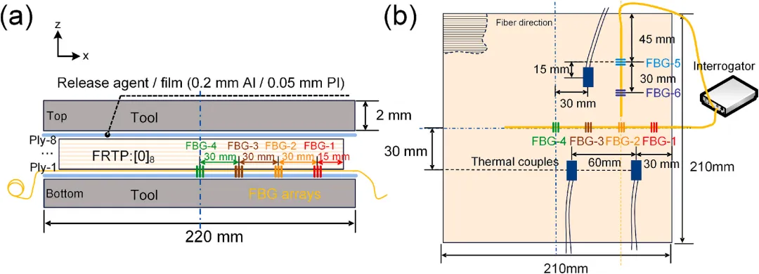 ✅ FBG 阵列嵌入方案突破了传统应变片无法耐受高温高压成形环境的限制(CF/PEI 工艺需 270 °C + 2 MPa),为热塑性复合材料成形过程监测提供了可落地的传感技术方案。