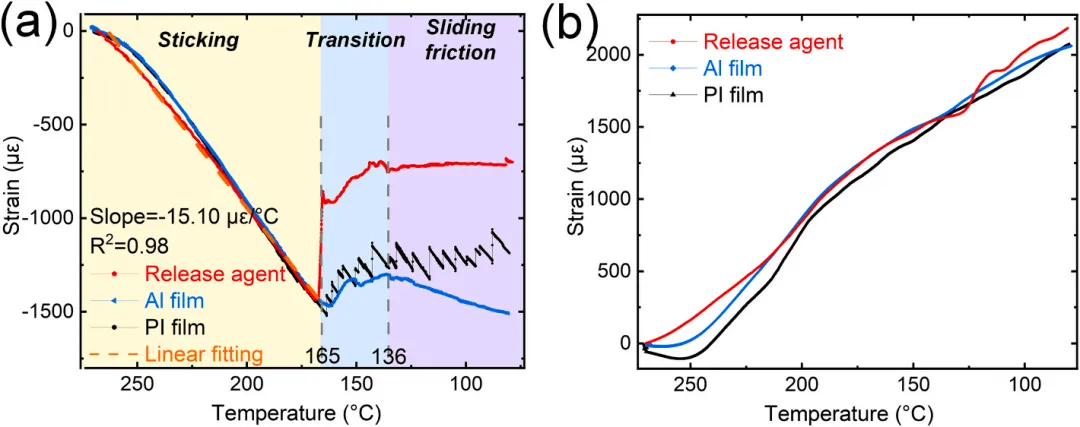 🟡 铝膜界面:脱黏信号微弱(47–244 με),因为 Al 膜从工装脱离后仍牢固黏连在 FRTP 上,其 CTE(约 23×10⁻⁶/°C)远高于 FRTP 纵向 CTE,导致脱黏后应变持续下降约 190 με,滑动摩擦系数最高(μ = 0.84)。
