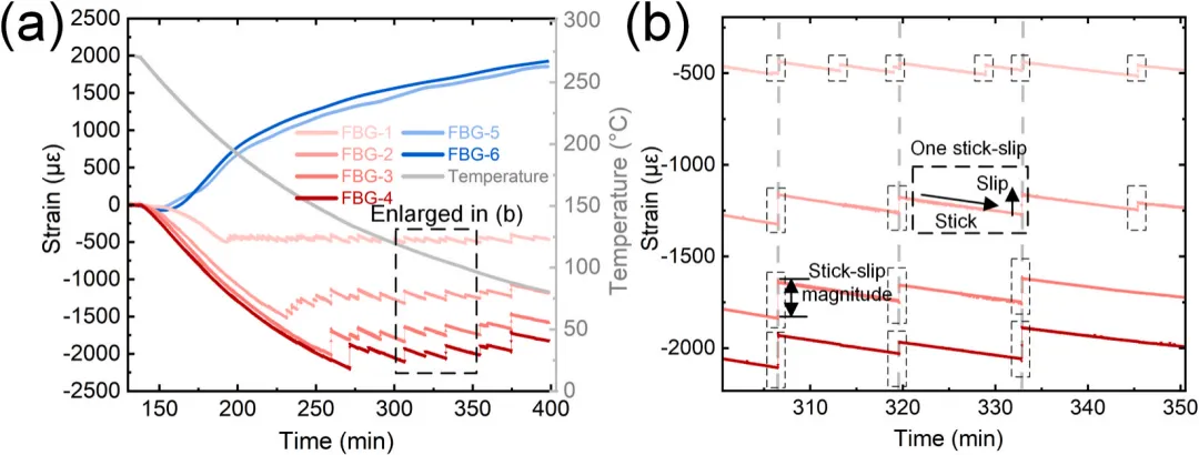所有纵向传感器(FBG 1–4)在冷却初期均呈现统一的黏着状态:应变以约 15.1 με/°C 的速率线性下降,脱黏时机集中在 165 °C——这说明三种界面在静摩擦阶段的"界面强度"基本相当,均受高模量不锈钢工装表面形貌主导。