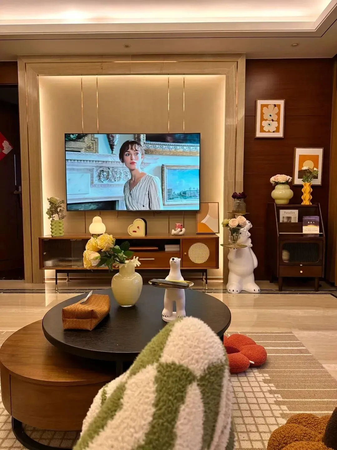 很多人关心客厅是不是要做大电视墙,其实只要墙面干净,配上几幅轻松的画、几个有趣的小摆件,氛围就出来了。