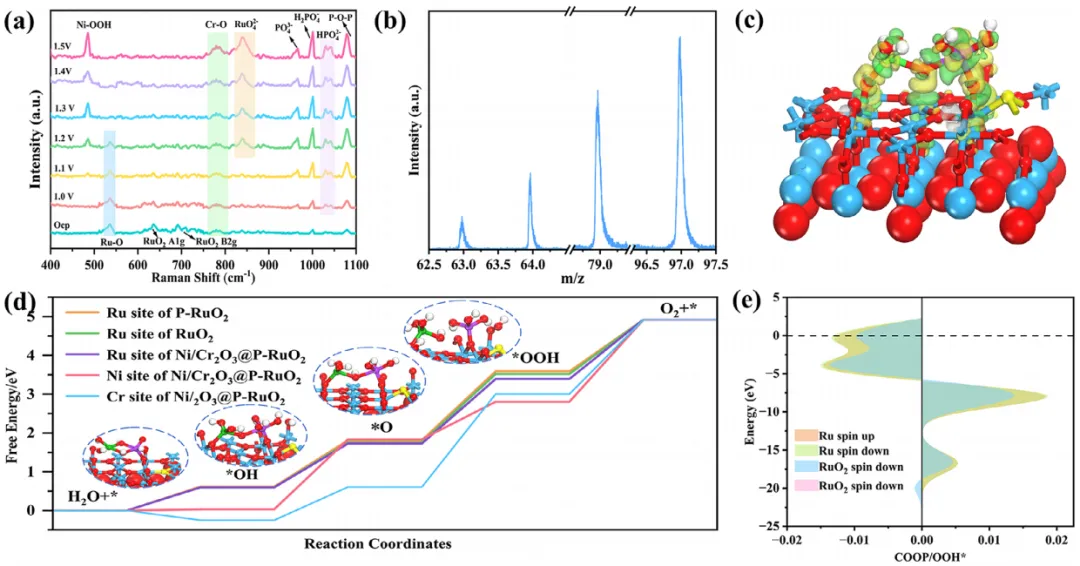 机理研究表明,该催化剂通过“路易斯酸+PO₄³⁻修饰”双重抗腐蚀机制突破耐久性瓶颈。X射线吸收近边结构(XANES)与密度泛函理论(DFT)计算揭示,Ni/Cr₂O₃向Ru的电子转移优化了Ru的电子结构,其不饱和配位缺陷增强了对反应中间体的吸附能力;原位拉曼光谱与飞行时间二次离子质谱(TOF-SIMS)证实,催化剂表面原位生成PO₄³⁻层,通过静电排斥抵御Cl⁻侵蚀,同时Cr₂O₃作为路易斯酸位点与PO₄³⁻协同,构建OH⁻选择性微环境,抑制Cl⁻富集。分子动力学(MD)模拟进一步验证,该双重机制有效阻断了RuO₂过氧化与溶解,使催化剂在海水高盐环境中保持稳定。此研究为设计抗腐蚀电解催化剂提供了新范式,有望加速AEMSE技术的工业化应用。