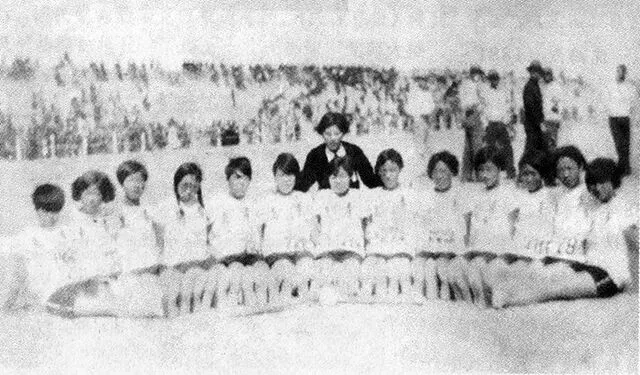 图为1932年获第十六届华北运动会女垒亚军的青岛运动员在河南开封体育场合影。