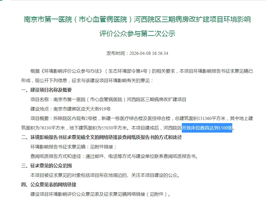 :“南京市第一医院(市心血管病医院)河西院区三期病房改扩建项目环境