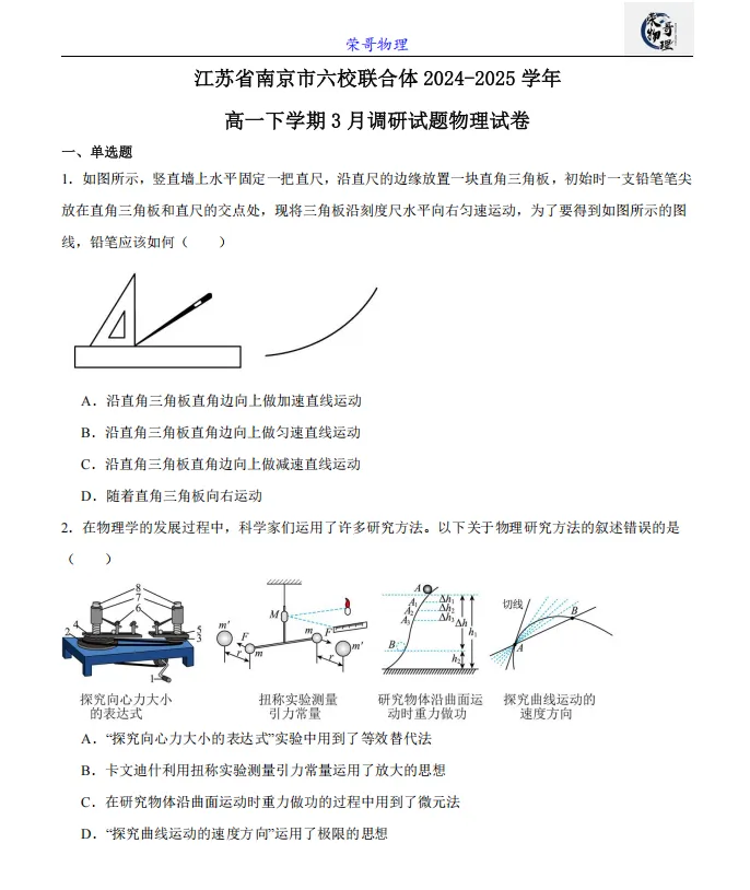 高一月考||江苏省南京市六校联合体2024-2025学年高一下学期3月调研试题物理试卷