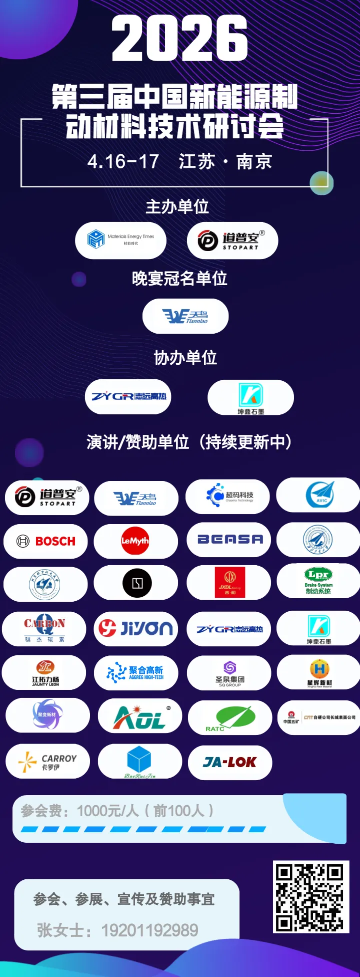 深圳宝锐金技术有限公司诚挚地邀请您参加2026年4月16-17日于南京举行的“2026年第三届中国新能源制动材料技术研讨会”。本届会议由山东道普安制动材料有限公司与材能时代联合主办,江苏天鸟高新技术股份有限公司晚宴赞助。期待与您相聚南京,共议行业前沿技术与发展。会议时间:2026年4月16日上午11点签到