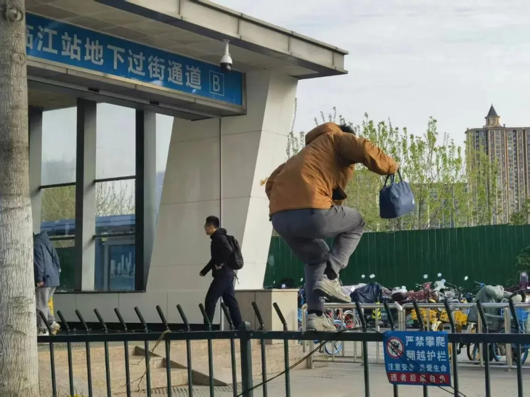有的抄近路的市民面对一米多高的绿化带护栏毫不费力就跨越过去,甚至有的市民如跨栏运动员一样,一个跃身而过。有的市民尤其是身材不高的女性市民,面对有危险的护栏跨越时感到为难,试了几次才跨越过去,耗时费力不说,还存在危险。不过记者发现,也有市民犹豫一番或试几下觉得危险而选择放弃,在快速化道路上向前走50米,从公交站台处再绕道折回进入地下过街通道。