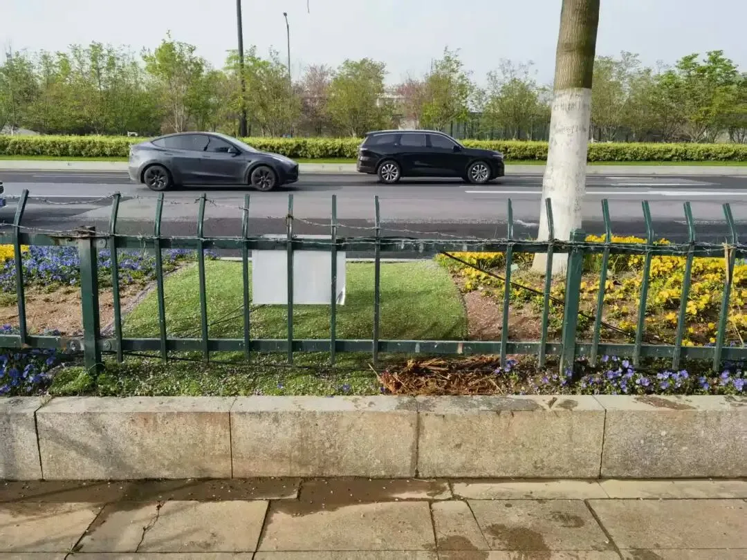 南京晨报记者注意到,铁质护栏跨越处,由于长期每天跨越护栏的市民多,不仅将绿岛花坛绿化踩踏坏,有关部门还在上面铺设一块绿色仿生草皮,而且有人还将护栏损坏留下一个缺口,以方便跨越。