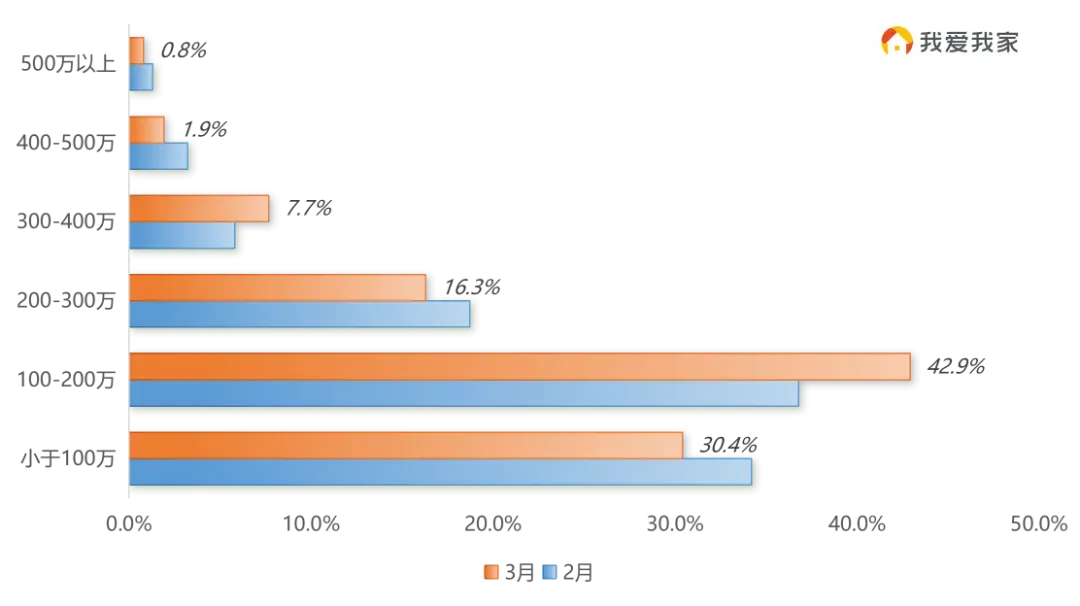 3月,300万以下价格段累计成交占比89.7%。