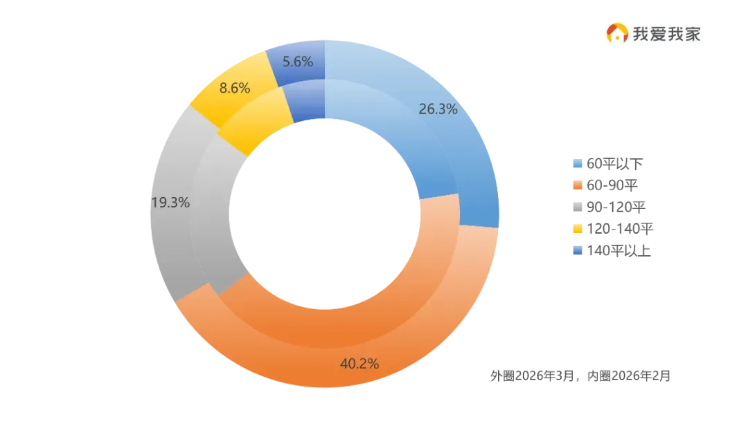 从面积段来看,60-90㎡成交比重仍是最高,占比达40.2%,60㎡以内成交占比26.3%,环比增加3.7%;