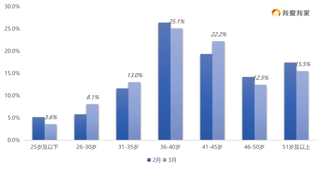 3月,二手房成交客群年龄结构小幅波动,其中36-40岁客群累计占比47.3%,仍是市场成交主力;26-35岁年轻群体成交比重达21.1%,环比增加3.7%,也反映了3月刚需成交占比提升。另外,41-45岁年龄段成交占比也增加2.9%,符合学区置业客户年龄画像。