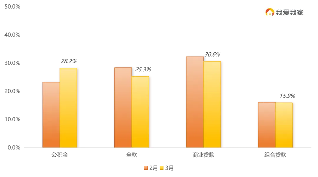 3月纯公购房比重达28.2%,环比再涨5%,与商贷占比基本持平,商贷买房成交占比30.6%,环比减少1.7%,还有15.9%客户选择组合贷款;另外,随着成交总价下滑,也有约1/4客群全款置业。