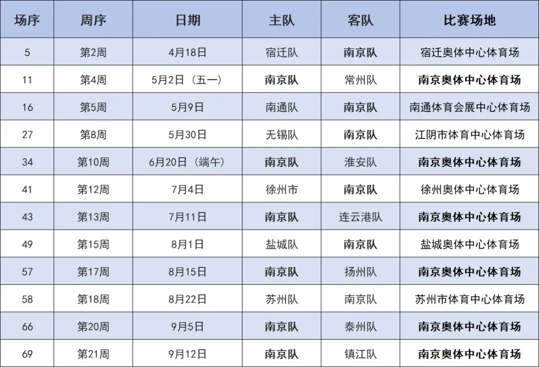 南京队的赛程表