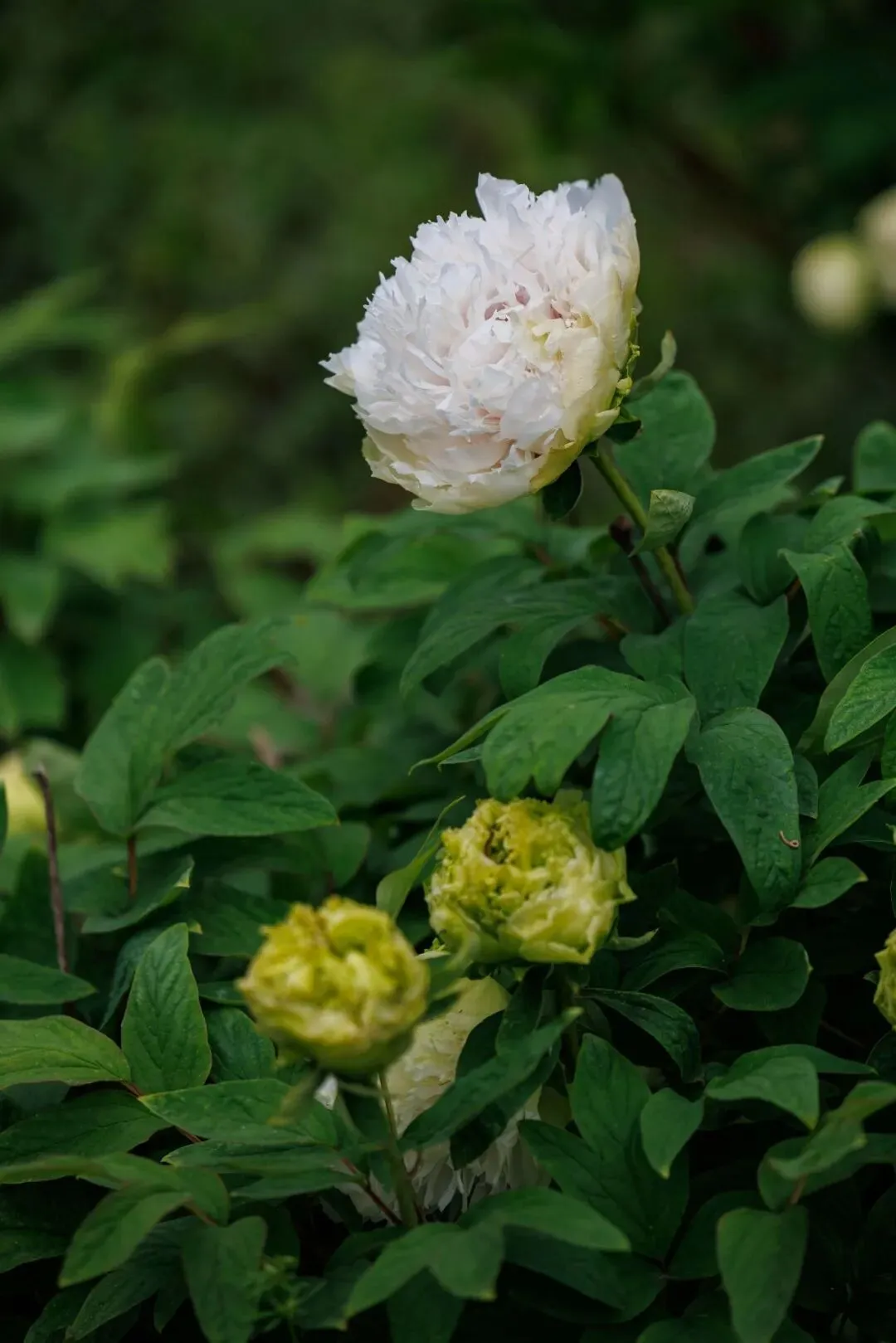 绿幕隐玉:绿色系经典,初开嫩黄绿色,盛开后白绿渐变,绣球型花型饱满,是晚花品种,花期比普通牡丹晚一周左右。