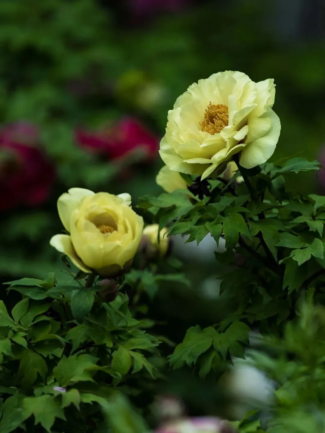 海黄:乳黄色半重瓣,外瓣舒展,内瓣层叠,中心橙黄雄蕊醒目,叶片深裂带锯齿,耐湿热,是江南牡丹园的晚花主力,还带着清甜的柠檬香。