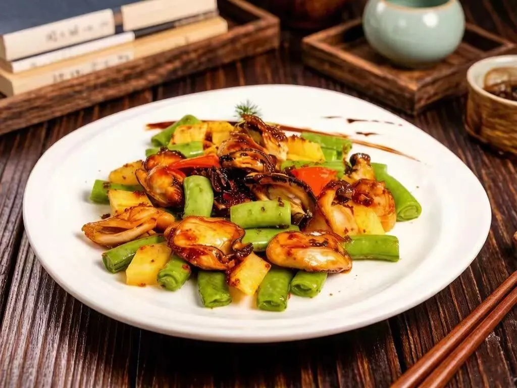 3、合炒出品:净锅下底油5克烧热,下菌皇酱10克小火炒出油脂香,下四季豆、日本大根丁中火翻匀,下煎蚝干快速翻炒裹酱,点鸡粉1克、白糖1克调味,装盘堆叠突出蚝干