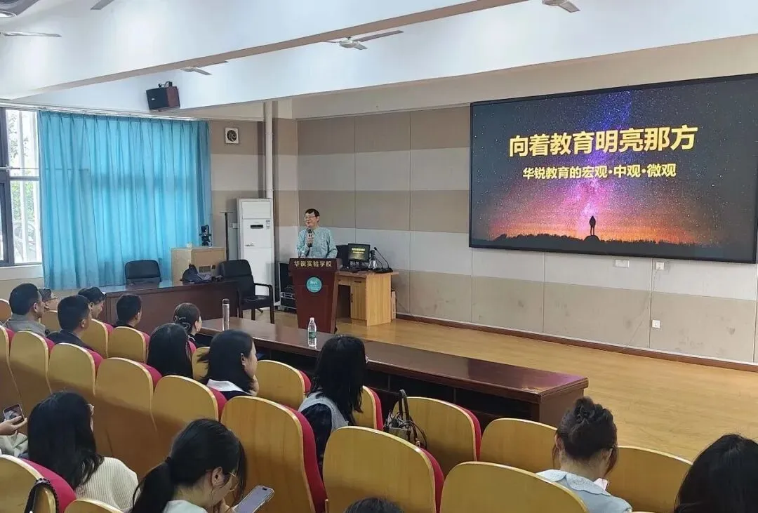 在随后的交流会上,韩荣寨校长以《向着教育明亮那方》为题,从宏观、中观、微观三个维度系统介绍了学校的发展思路: