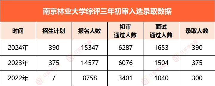 南京林业大学近两年报名人数较多,2023年新增了5819名同学报名,2024年新增了770名同学报名,共有15347人报名,初审通过人数为6287人,初审通过率为40.97%,面试通过人数为1653人,面试通过率为10.77%,最终录取人数为390人,最终录取率为2.54%。南京林业大学考评分满分400分,其中初审条件分满分200分,面试考核分满分200分,2024年考评分最高为342.333分,考评分300分以上的有13位同学,学校考评分第400名的同学考评分为221.667分,学校考评分第500名的同学考评分为216分,考评分5分集中了100人,可见在高分段人数较少,低分段人数较为集中。