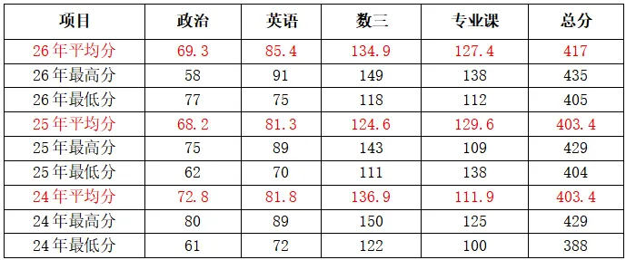 公共课中,政治近三年平均分稳定在68-75分区间,属于常规基础分值;英语平均分不断上涨,26年为85.1分,分数区间为82-92分,整体分数偏高,难以拉开明显差距,需稳定发挥避免拖后腿。