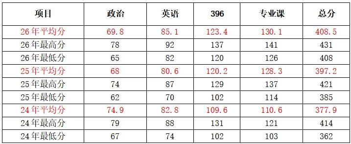 396与专业课是影响总分的核心科目,近三年396平均分稳步提升,26年为123.4分,较24年的109.6分提升了13.8分,26年分差17分是拉开总分差距的关键科目。专业课26年平均分130.1分,连续两年稳定在125分以上,且高于24年最高分121分,说明近两年专业课给分宽松,复习到位即可获得高分。