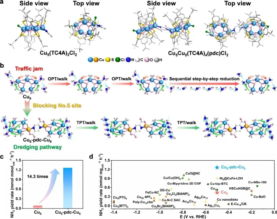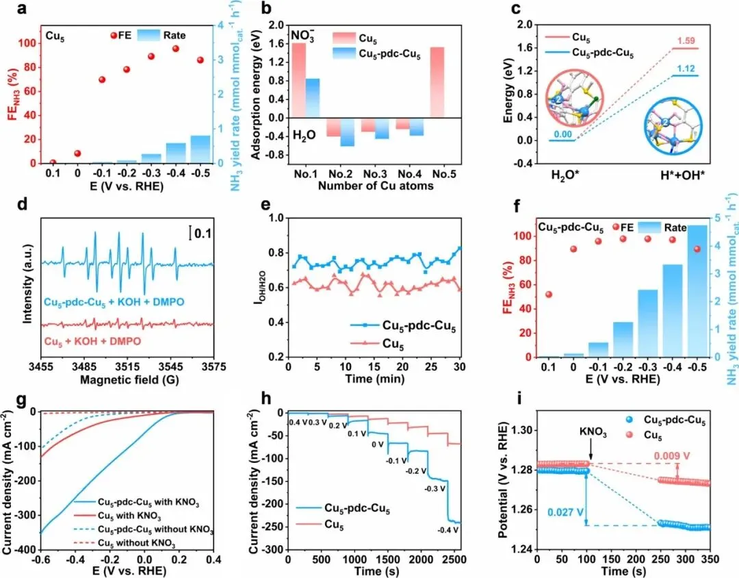 Cu5-pdc-Cu5催化剂的特殊设计连接子有目的地屏蔽两个硝酸根活化位点,从而使来自水活化的三个质子能够在两位点相对位置与等待的硝酸根反应。