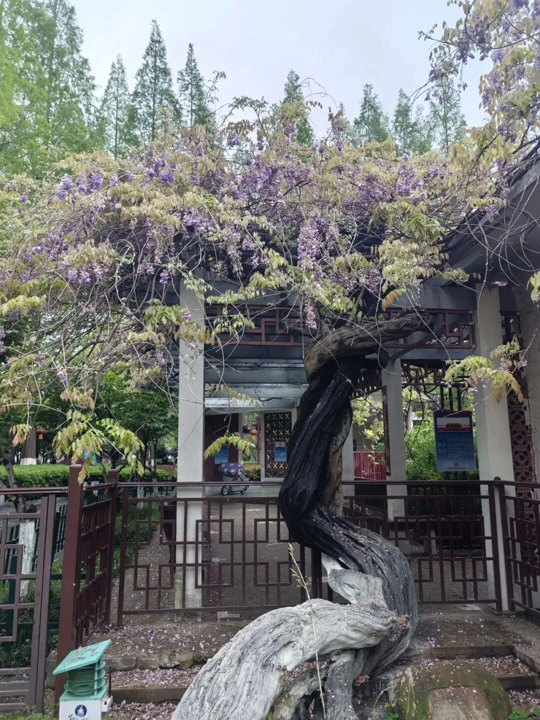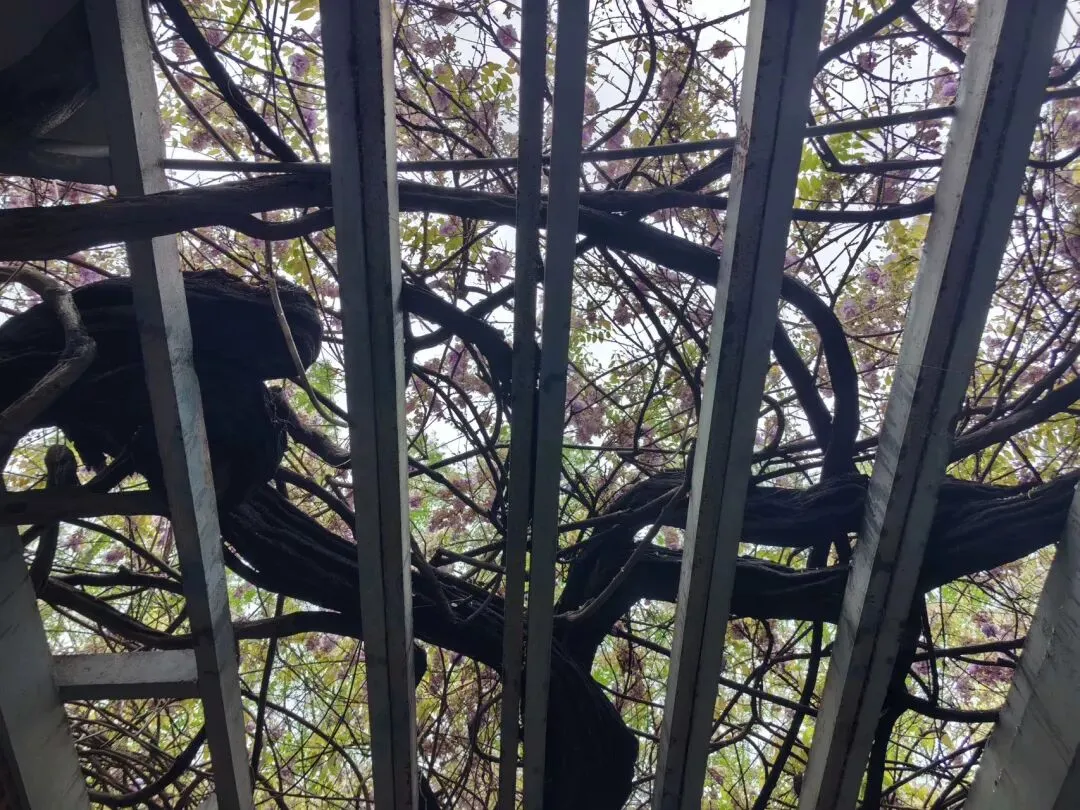 紫藤花树干好粗啊,不愧是600多年的老树。我来晚了,花没有那么惊艳,叶子长出来了,又下了几场雨。但蔓延十几米的枝蔓还是挺震撼的。