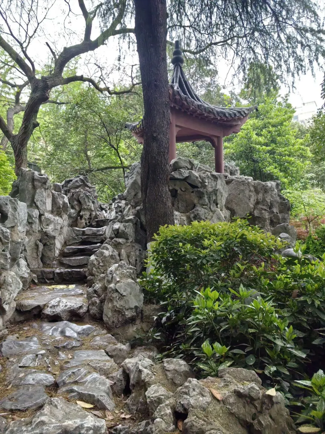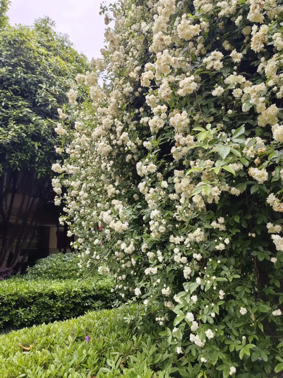 走走公园里的小假山的台阶,从亭子左侧走下去,我看到了一棵美丽的木香树!