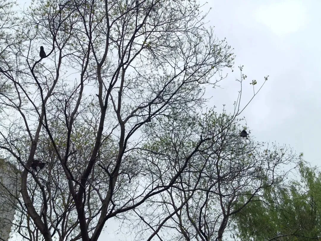 在这旁边,看到几只鸟在柔软的枝条啄食嫩叶,有时啃食嫩叶像在做倒立;有时站在柔韧的枝条上,啄食树叶带来枝条晃动,它们又像在荡秋千;即使扑扇扑扇翅膀,我也觉得好有趣,也拍了一段视频。
