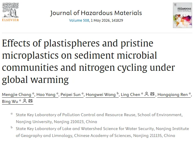 环境科学与生态学期刊Journal of Hazardous Materials(影响因子=11.3,中科院1区TOP期刊)近日刊发题为“Effects of plastispheres and pristine microplastics on sediment microbial communities and nitrogen cycling under global warming”的论文,该研究揭示生物膜包裹的微塑料(plastispheres)与原始微塑料对沉积物微生物群落及氮循环的相反影响,且全球变暖会削弱这种差异、推动效应趋同。