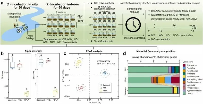 该研究以南京九乡河为对象,先原位培养30天获得plastispheres,再通过实验室微宇宙实验(设25°C、29°C、35°C三组温度),结合高通量测序、15N同位素配对等技术,分析两者对沉积物微生物群落与氮循环的影响。结果发现:plastispheres比原始微塑料更显著改变微生物多样性(提升但网络稳定性下降),因引入外源微生物加剧竞争;两者对氮循环影响相反——plastispheres降低反硝化率(21.75%)和N2O排放(39.45%),原始微塑料则增加(反硝化+31.42%、N2O+23.81%),源于反硝化菌群落(nirS/nirK型)的变化;变暖(35°C)会削弱差异,因高温选热耐受菌、促进群落趋同,温度成主导因子。
