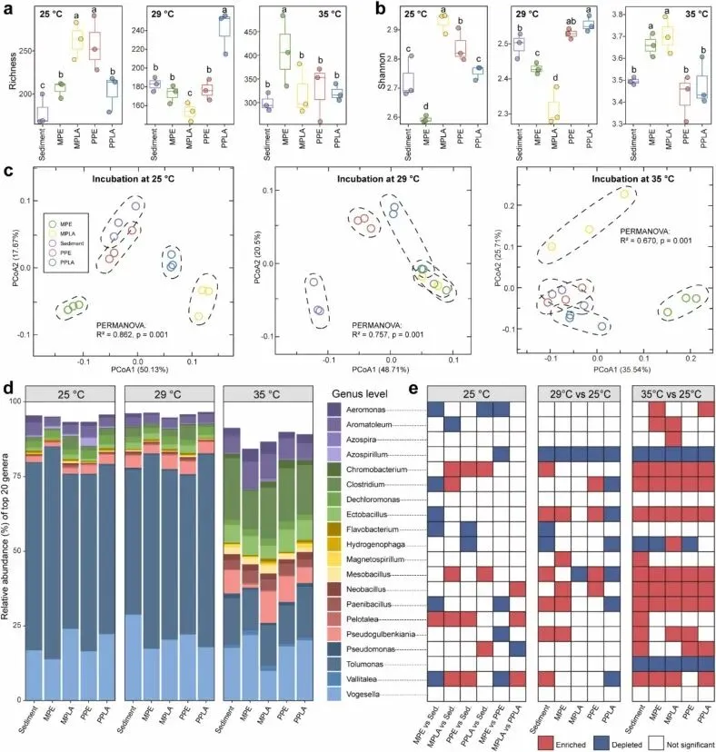 图2:呈现不同处理(plastispheres/原始微塑料、温度)对微生物α多样性(丰富度、香农指数)、β多样性(PCoA聚类)及优势属(如Chromobacterium在MPLA组增加)的影响。