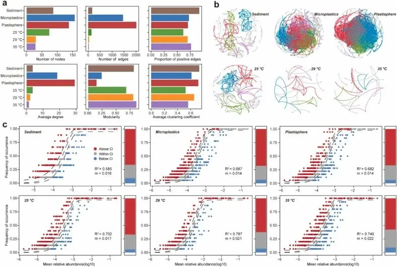 图3:说明plastispheres与原始微塑料对微生物共现网络(节点/边增多、模块化降低)的改变,及群落组装(确定性过程主导,升温后随机过程占比增加)。