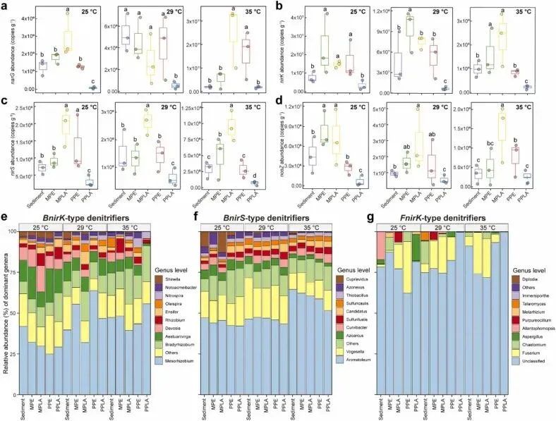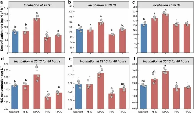 图4:展示25°C、29°C、35°C下,plastispheres(抑制)与原始微塑料(促进)对反硝化率及N2O排放的反向影响,及高温下差异缩小。