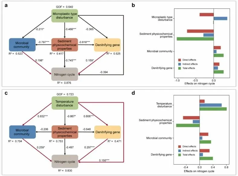 图6:用偏最小二乘路径模型(PLS-PM)揭示材料类型(通过微生物群落+沉积物性质)与温度(主要通过微生物群落)对氮循环的调控路径。