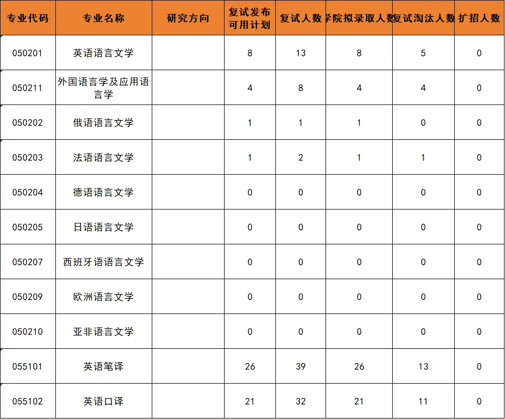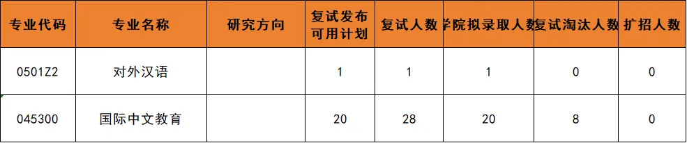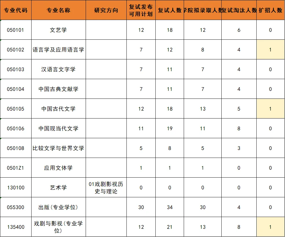 语言学及应用语言学、中国古代文学、戏剧与影视(专业学位)相较于26可用计划,分别扩招1人,其他专业无扩招。