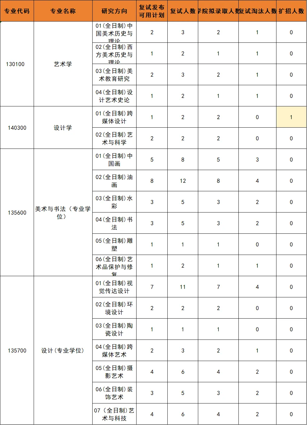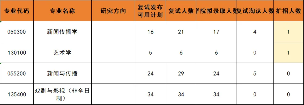 其中新闻与传播学学和艺术学专业相较于26可用计划,扩招了1人,其他专业无扩招。