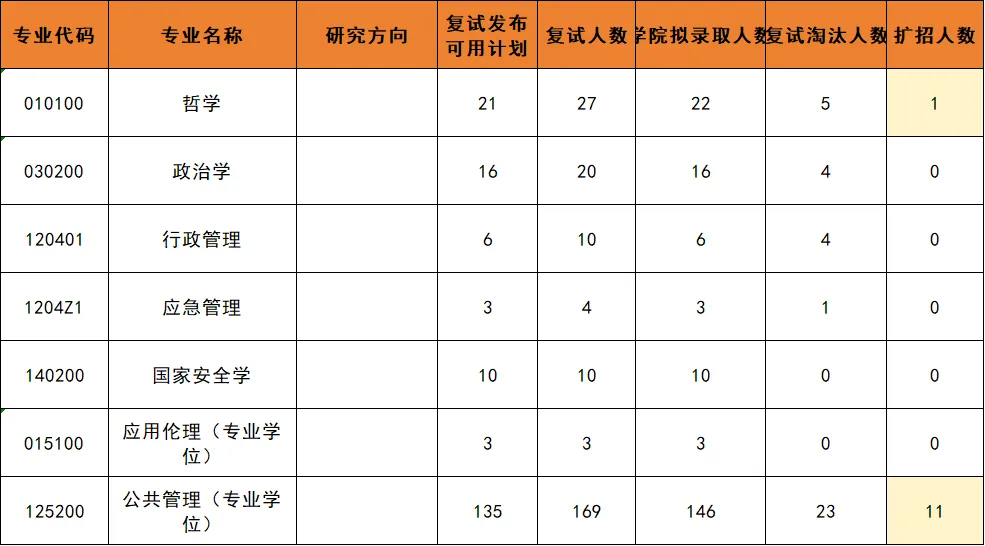 其中哲学相较于26可用计划,扩招了1人,公共管理(专业学位)扩招了11人。其他专业无扩招。