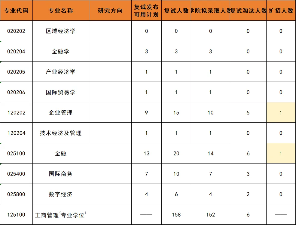 企业管理和金融专硕专业各扩招1人。其中区域经济学拟录取考生均为推免考生,无统考生。其他专业无扩招。