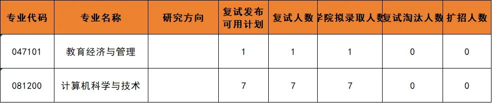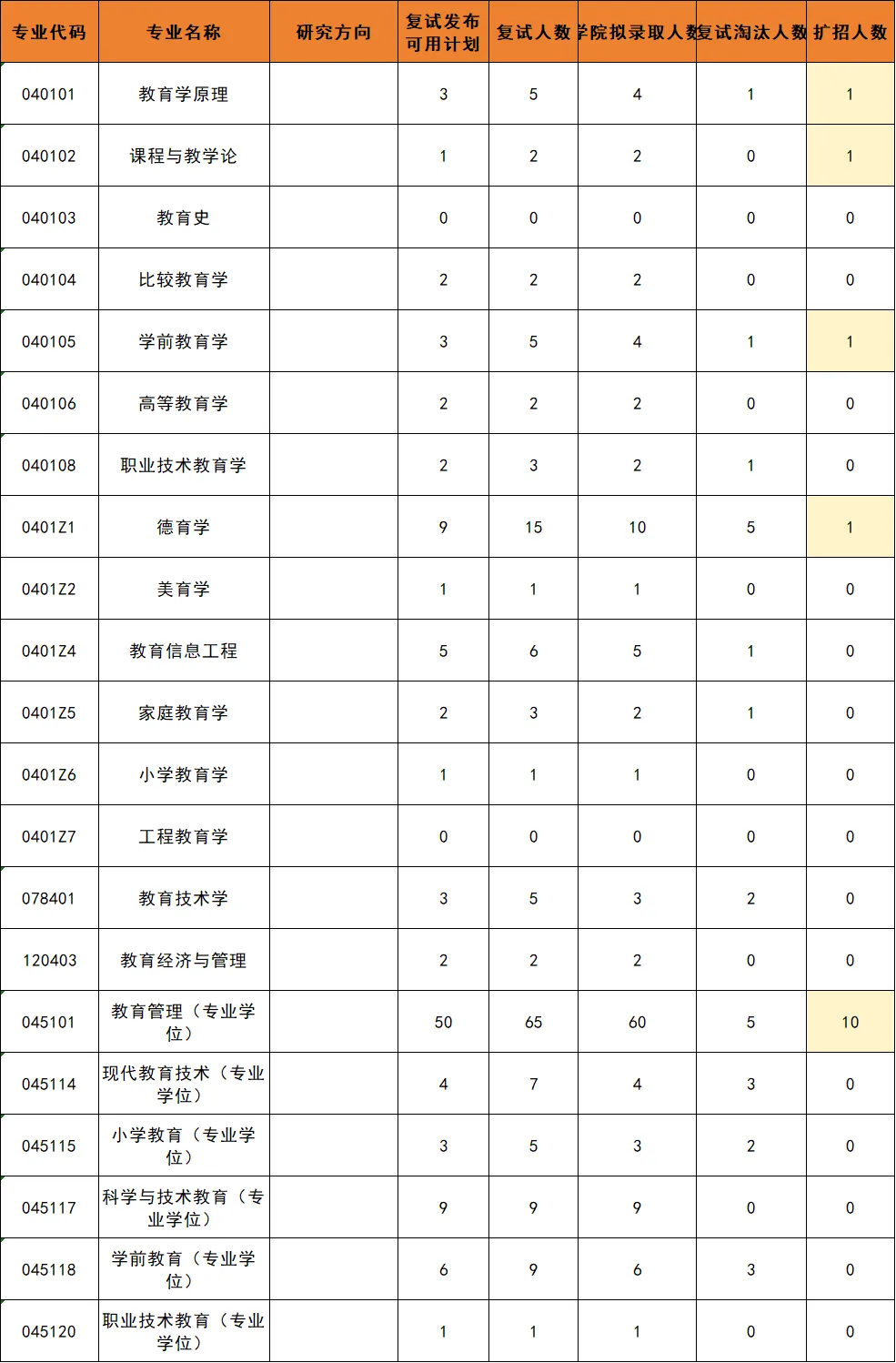 其中教育学原理、课程与教学论、学前教育学、德育学分别扩招了1人。其他专业无扩招。