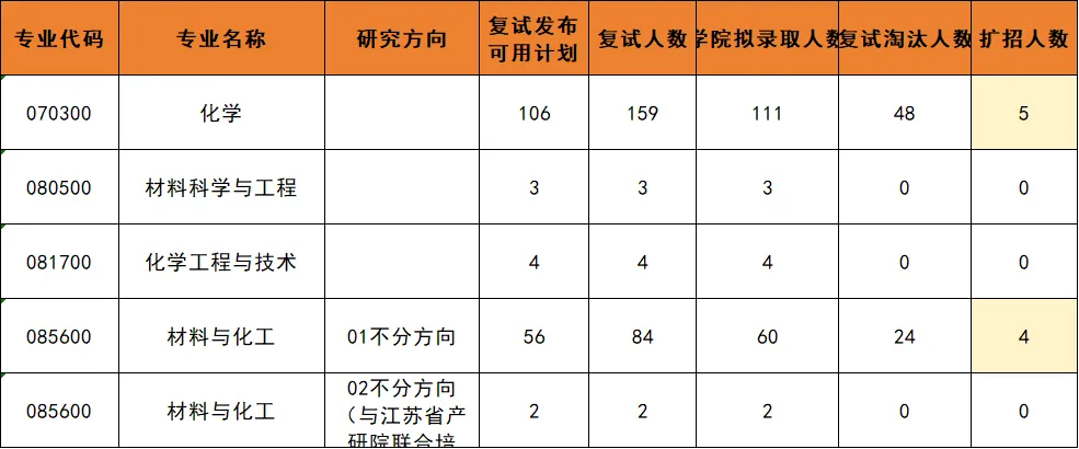 其中化学专业扩招5人,材料与化工专业01方向扩招4人,其他专业无扩招。