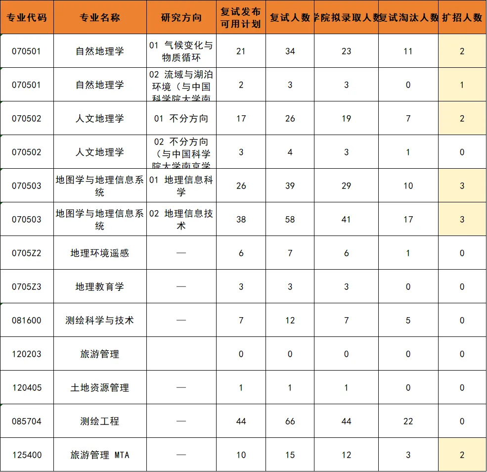 其中自然地理学01方向扩招2人,02方向扩招了1人,人文地理学01方向扩招2人,地图学和地理信息系统01和02方向均扩招2人。旅游管理专业录取考生全部为推免生。