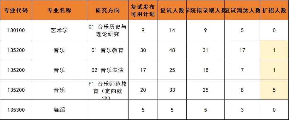 其中音乐(专业学位)01方向和02方向均扩招1人,音乐(专业学位)F1方向扩招5人。