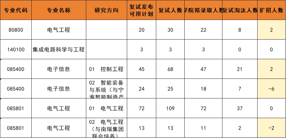 其中电气工程学硕扩招2人,电子信息01方向扩招2人,电子信息02方向缩招6人,电气工程专硕02方向缩招2人。