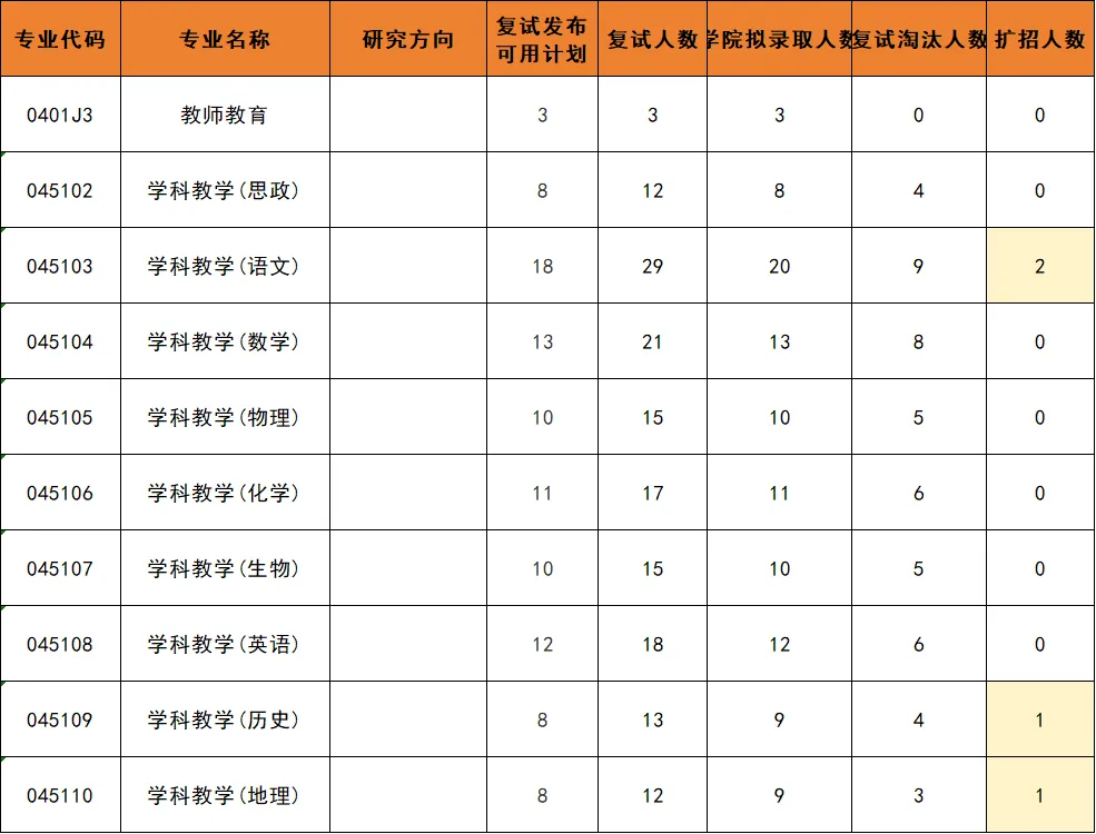 其中学科教学(语文)扩招2人。学科教学(历史)和学科教学(地理)分别扩招1人,其他专业无扩招。