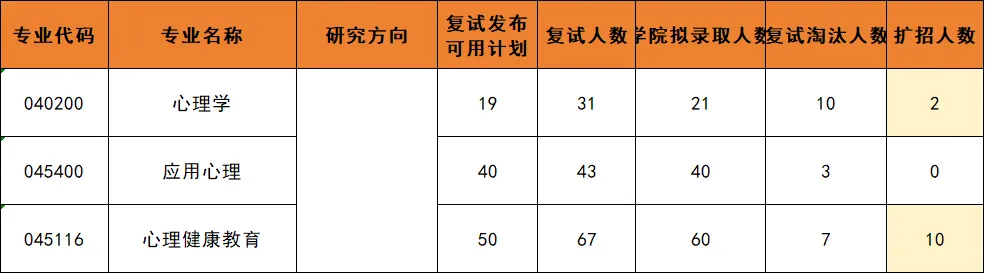 其中心理学扩招2人,心理健康教育专业扩招10人,其他专业无扩招。