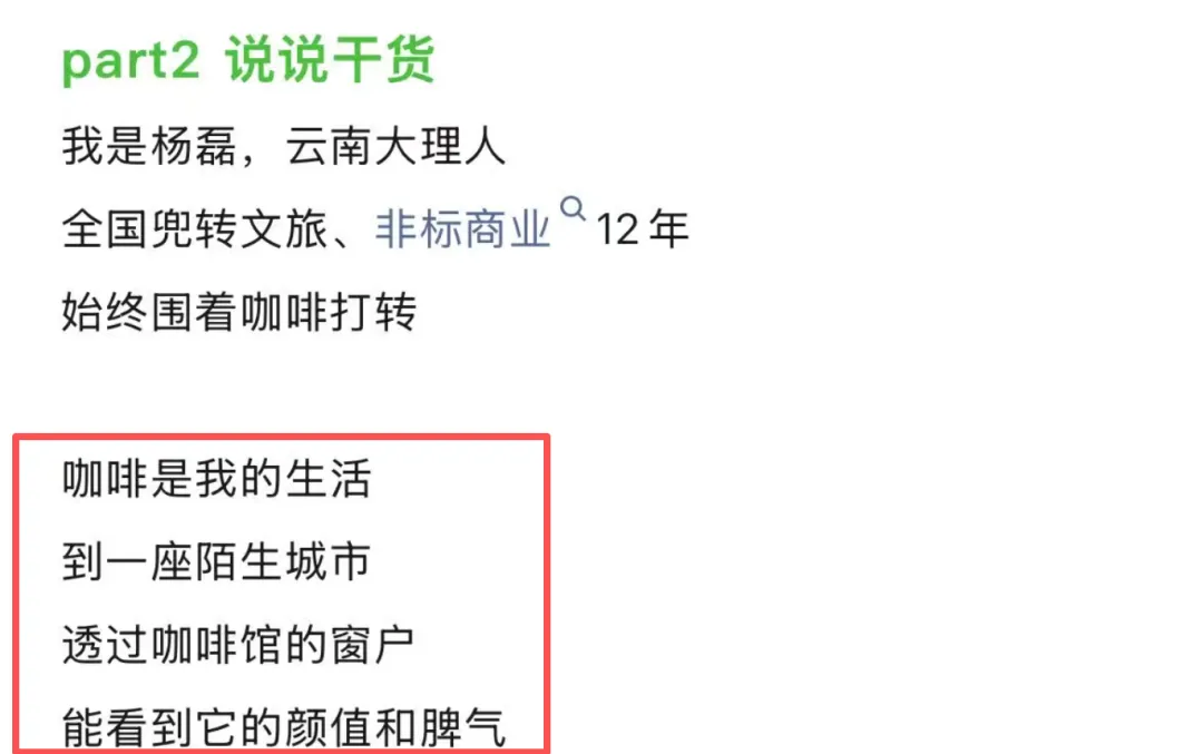 滇之光文旅联合创始人 的杨磊 在他的公众号《杨磊微能量》中写到“咖啡是我的生活到一座陌生城市透过咖啡馆的窗户能看到它的颜值和脾气”。