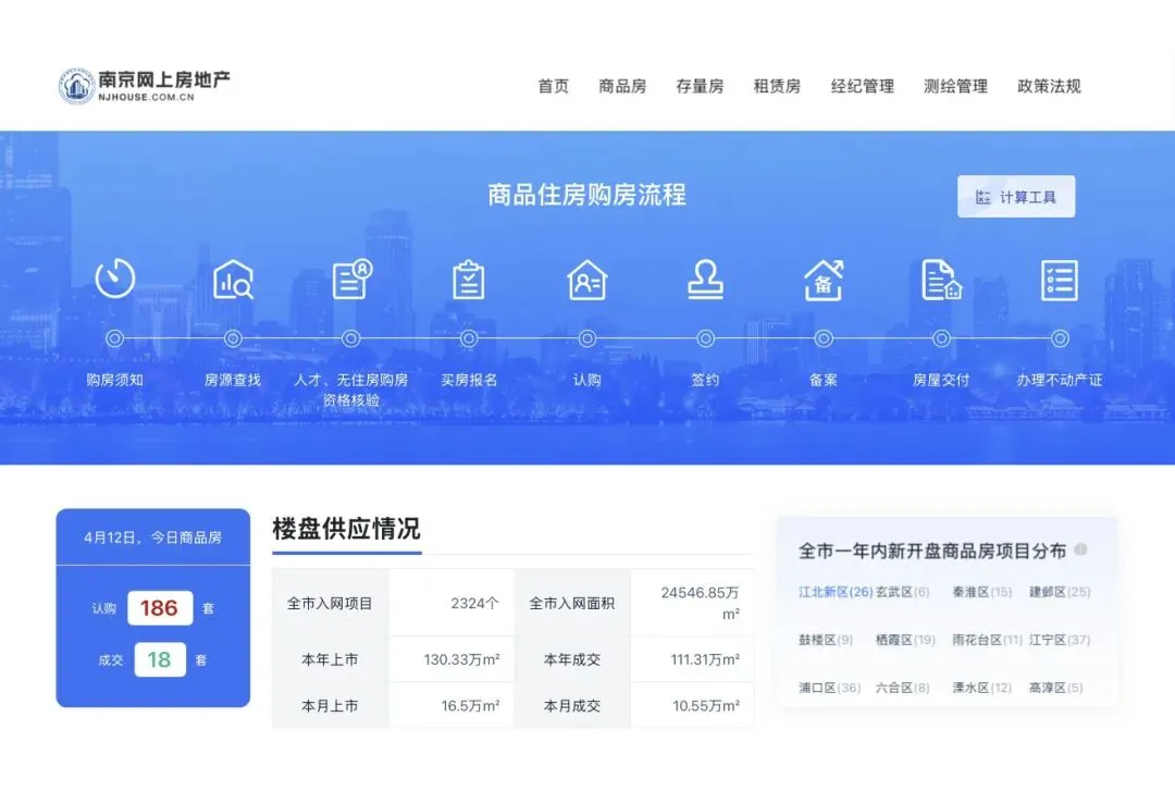 据南京网上房地产官方数据,截止到2026年4月12日,南京商品房认购186套,成交18套。