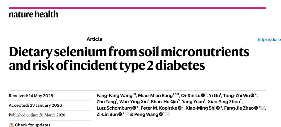 近日,南京农业大学汪鹏教授团队联合东南大学附属中大医院、中国疾控中心等单位,在Nature Health在线发表题为Dietary selenium from soil micronutrients and risk of incident type 2 diabetes的研究论文。该研究揭示了我国人群硒营养的地域分异格局,发现血清硒水平偏高会增加糖尿病和高脂血症风险,并证实土壤硒与人群血清硒高度相关,表明土壤是影响居民硒营养状况的关键因素。该研究结果为我国科学补硒、富硒产业规范和慢病防控发展提供了重要科学依据。