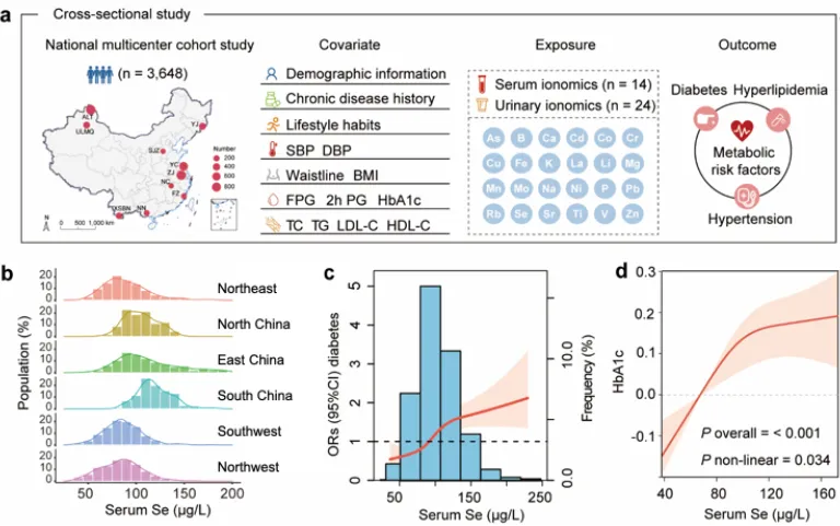 研究发现,硒、锌、铬等微量营养素与代谢结局密切相关,其中高血清硒与糖尿病和高脂血症风险升高的关联最为突出。与低硒人群相比,血清硒达到或超过110 µg/L的人群,糖尿病和高脂血症患病风险分别升高158%和94%;前瞻性随访显示,与低硒人群相比,高血清硒组糖尿病发病风险增加35%;性别分层分析发现,这一关联在男性中更为显著,风险增幅达96%,而女性中未见统计学显著关联。进一步分析表明,当血清硒超过110µg/L后,胰岛素抵抗和糖化血红蛋白水平明显升高。