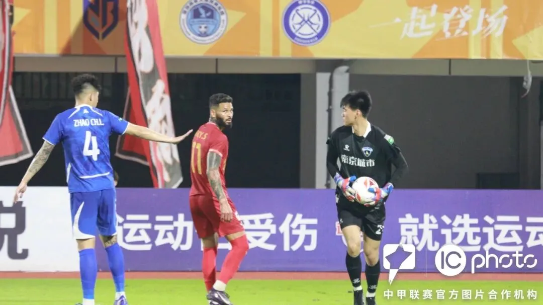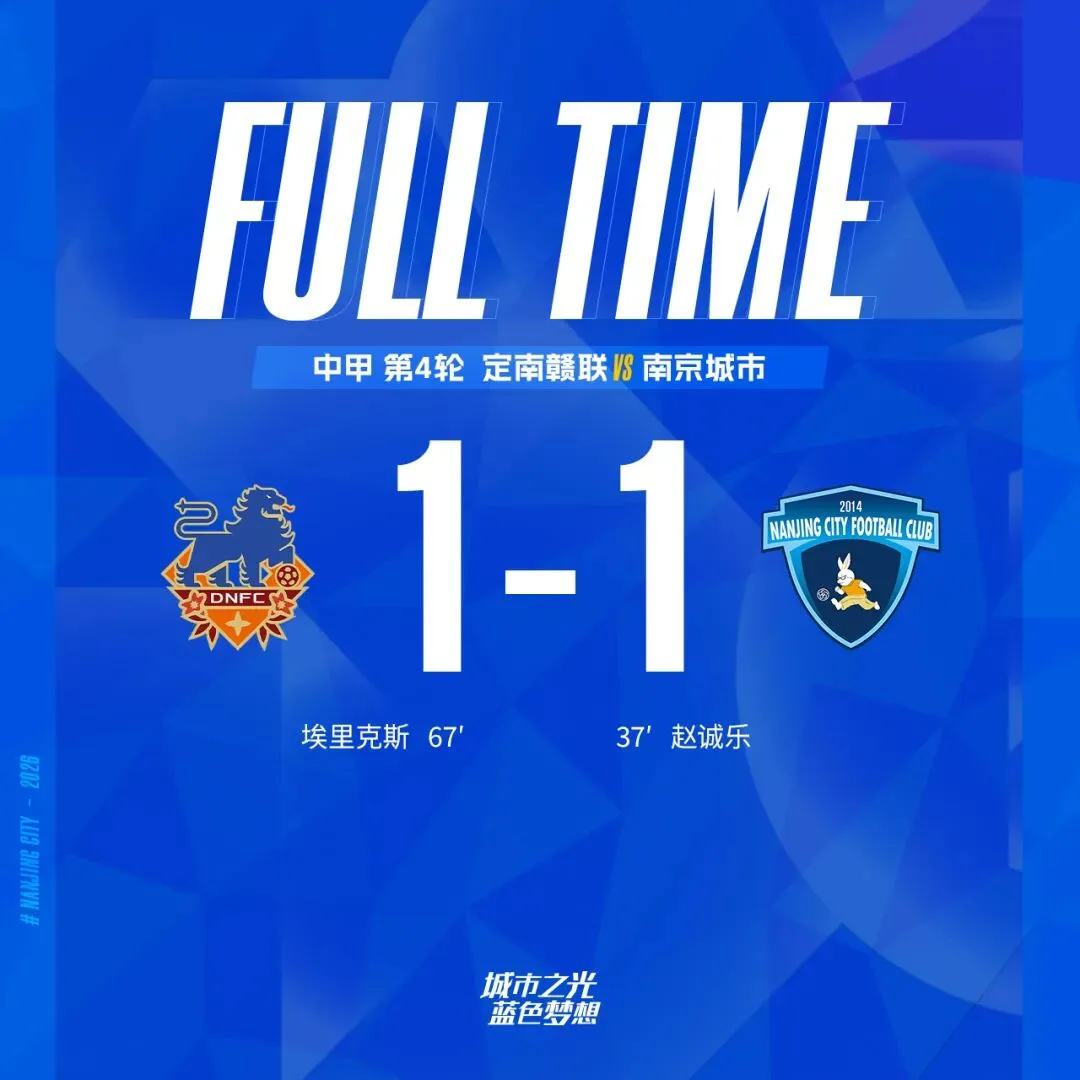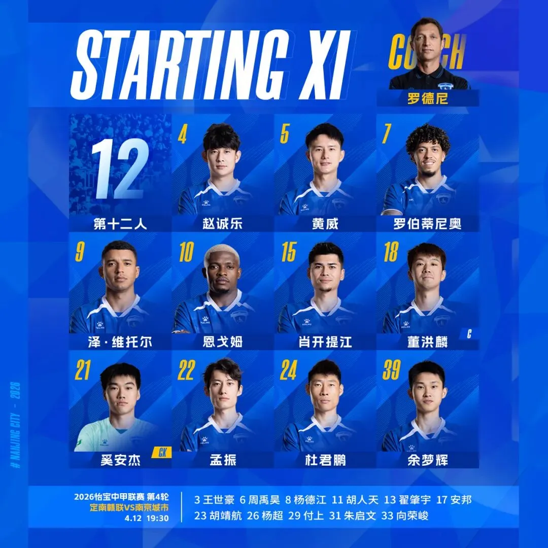 4月12日,2026怡宝中甲联赛第4轮比赛,南京城市客场挑战定南赣联。上半场,赵诚乐头球首开纪录;下半场,定南赣联兜射破门扳平比分。最终,南京城市客场战平定南赣联。第16分钟,禁区内一片混战,奚安杰注意力集中,迅速反应跪地将球抱住;第18分钟,定南赣联小角度射门,赵诚乐封堵将球解围;第19分钟,恩戈姆下底传中,后点的罗伯蒂尼奥迎球打门,可惜射门高出横梁;第25分钟,余梦辉左路传中被定南赣联解围,恩戈姆趁机夺得球权不停球直接打门,可惜射门打高;第37分钟,余梦辉开出角球,赵诚乐高高跃起头球破门,定南赣联0:1南京城市;第45分钟,孟振下底传中,维托尔插上射门,遗憾球擦左侧立柱滑出;下半场易边再战。第53分钟,黄威将球交给恩戈姆,后者利用个人能力创造出空间射门,可惜球高出横梁;第60分钟,维托尔发动反击,恩戈姆过掉一人后单刀面对门将,可惜射门角度过正,球被门将没收;第67分钟,定南赣联进球,定南赣联1:1南京城市;第86分钟,向荣峻回敲杨德江,后者调整后打门,遗憾偏出球门右侧立柱;第90+4分钟,付上将球转移至右路,安邦快速推进面对门将遗憾将球打高;赛后新闻发布会上,主教练罗德尼表示:“我们知道在定南这个客场打比赛是非常困难的,上半场比赛印证了这一点。但上半场的比赛相对来说还是比较平衡的,我们也创造出不少进球机会,除了一个定位球进球,也创造了一些进球机会。只不过没打进去。下半场对手的反扑也是比较凶猛的,我们在防守端的消耗很大,但也创造出几个比较好的得分机会。当然,对我们来说,这场比赛原本是有可能拿到三分回到南京的。但是总结来看,一分也是我们团队共同努力的一个非常好的结果,不是所有的球队来到定南都能轻易拿分的。我还要表扬我们团队的拼搏精神,他们都非常努力。回到主场,我们会继续好好总结好好准备,争取在主场拿到三分。”后卫:赵诚乐(84’向荣峻)、孟振、杜君鹏、肖开提江(72’翟肇宇)