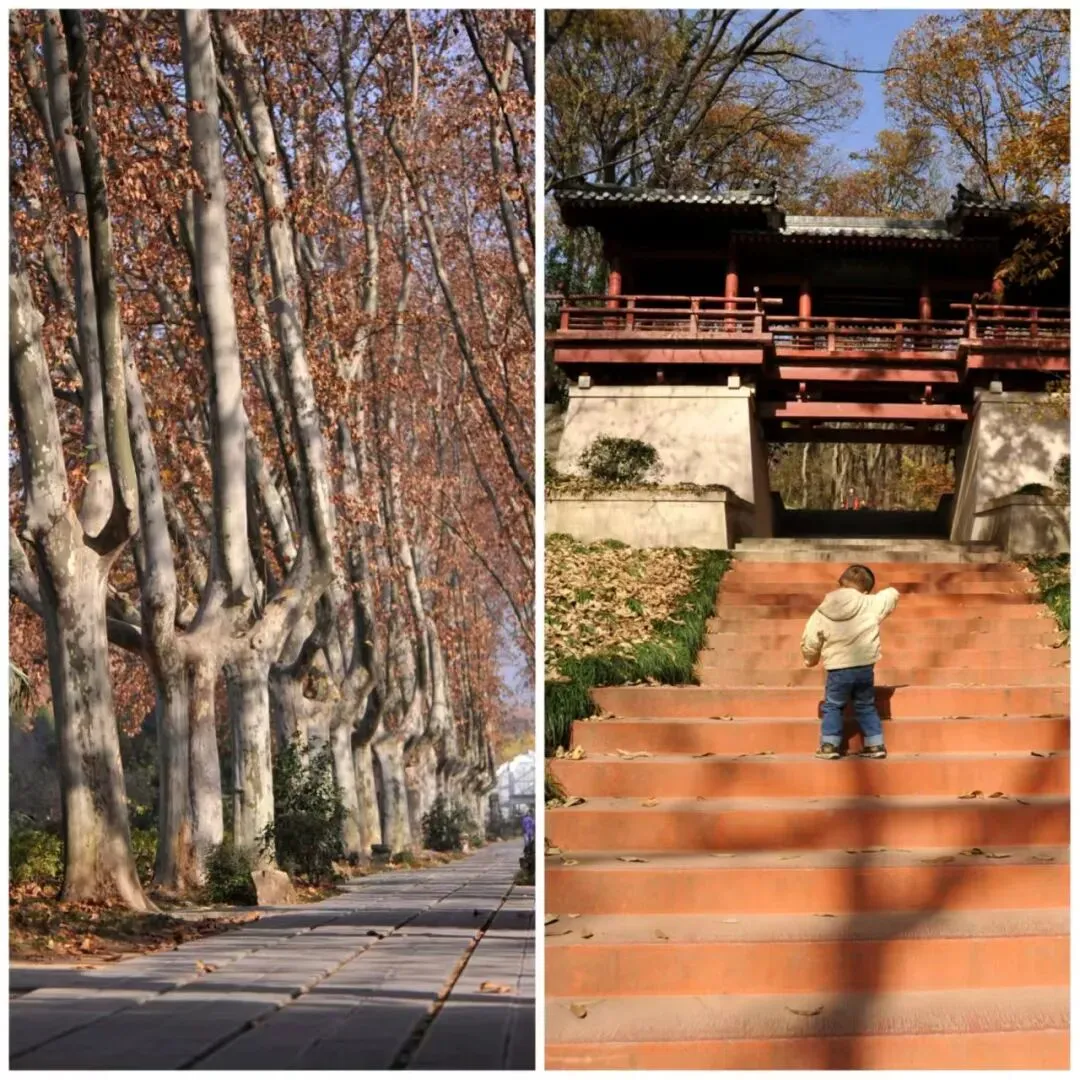 对幼龄的孩子来说,明孝陵的石象路是最好玩的。壮观的石雕神兽静静伫立,色彩斑斓的落叶铺满小径,走到哪儿都能“捡秋”,玩得不亦乐乎。